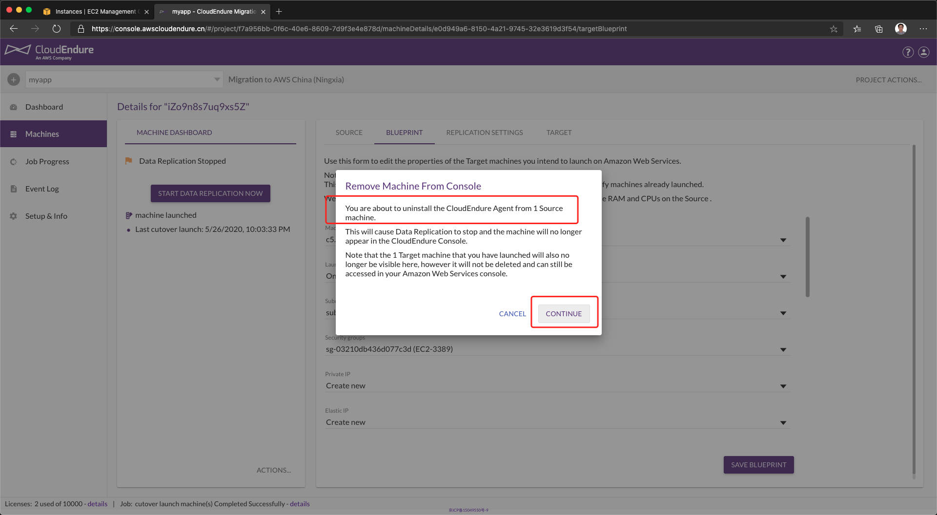 此时界面将提示是否要继续移除本服务器,这个过程还将从源服务器上卸载CloudEndure后台服务。点击Continue继续。如下截图。
