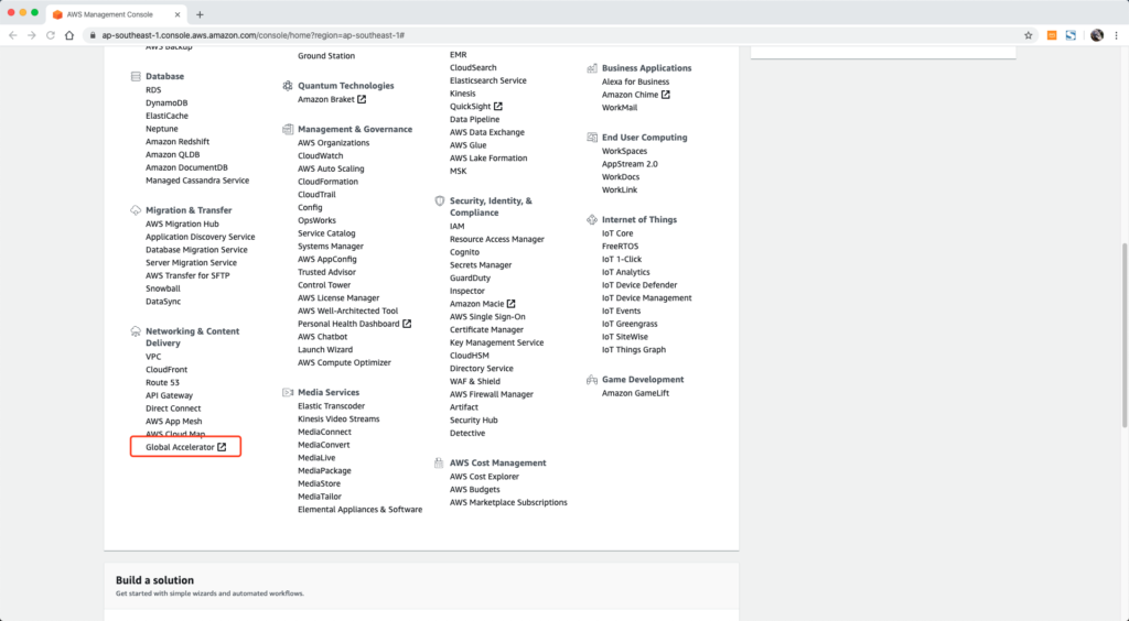 首先进入AWS控制台,从服务清单中,找到Global Accelerator(在网络分类下)。如下截图。