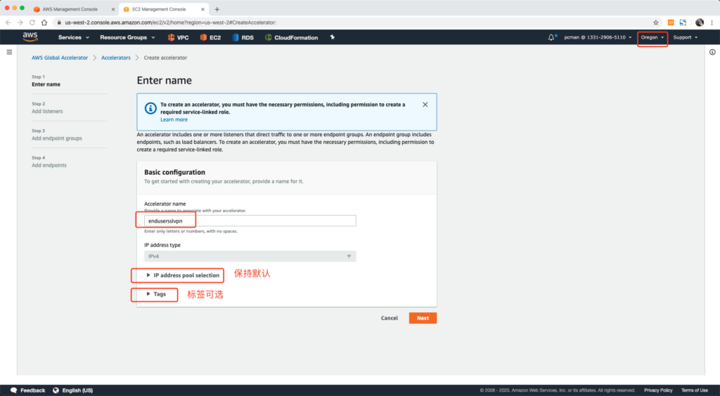 在向导的第一步,输入创建GA加速器的名称。例如输入endusersslvpn的名字。如下截图。