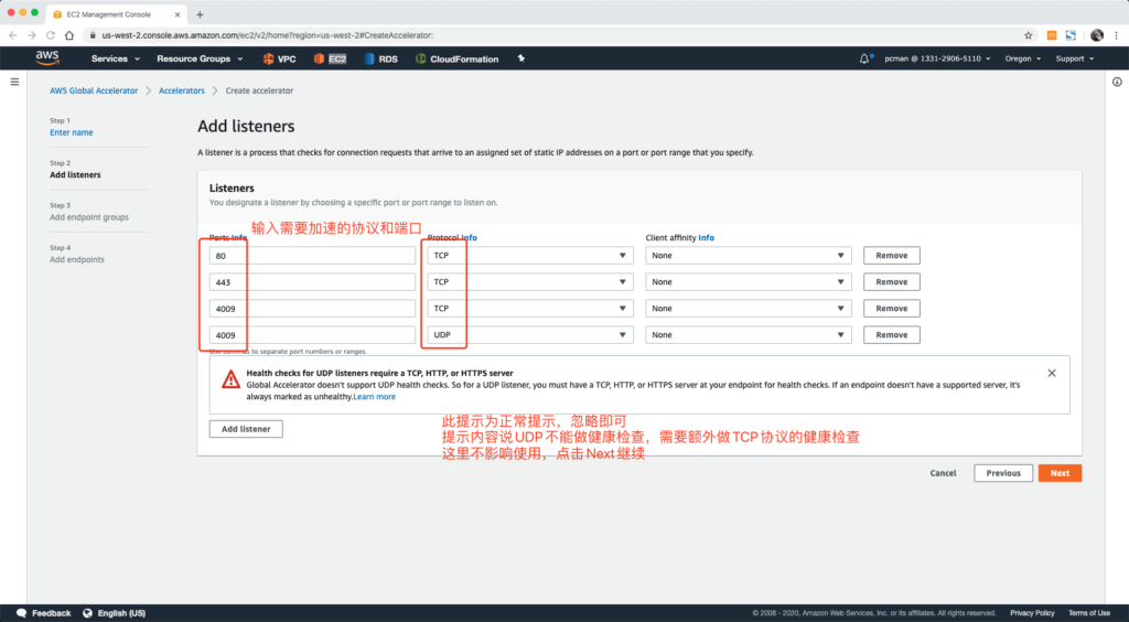 在向导第二步,输入要加速的协议和端口。如果有多个端口,需要添加多条数据。例如,这里分别添加了TCP 80、TCP 443、TCP 4009和UDP 4009共4个端口。其中,页面提示信息说UDP协议不支持健康检查,可忽略这个提示,点击下一步继续。如下截图。