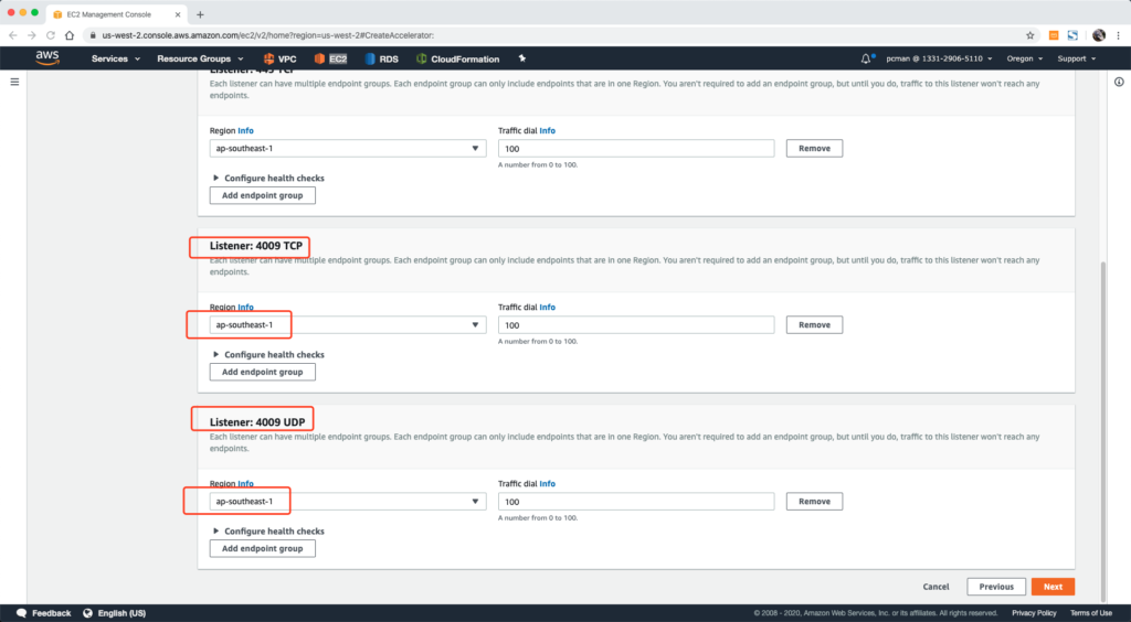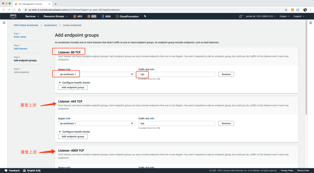 向导的第三步,选择每个端口映射的区域,例如本测试中,所在源是新加坡区域,因此在配置界面上,将所有region都设置为ap-southeast-1 。如下截图。