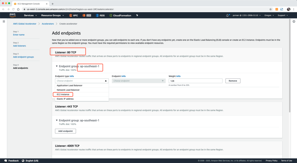 向导的第四步,是设置每个端口加速的源。首先找到第一个端口80端口,点击Add Endpoint后,页面上会出现一行新的条目,在Endpoint Type终端服务类型中,展开下拉框中选择EC2。如下截图。