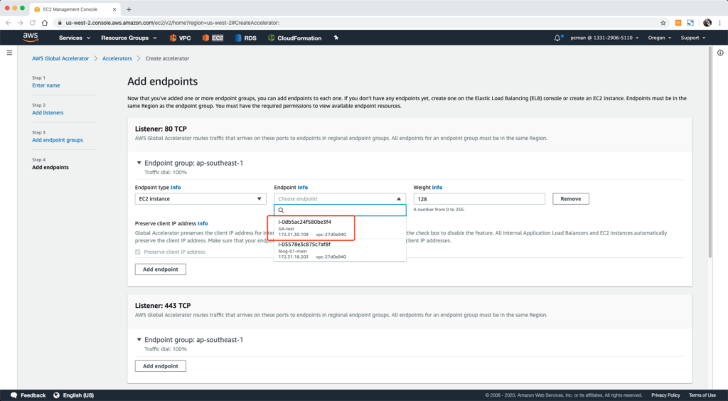 接下来Endpoint位置会加载出来本区域的EC2实例清单。从总选择搭建SSL VPN服务的EC2。边上权重选项默认是128,不需要调整此数字。如下截图。