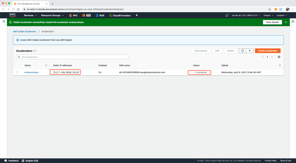 创建GA完毕后,回到GA清单界面,可以看到刚才创建的加速器,状态是处于“创建中”,并且此时已经具有了Anycast IP地址:75.2.11.149和99.83.152.20。稍后在服务正常化之后,就可以使用这两个IP地址访问。如下截图。
