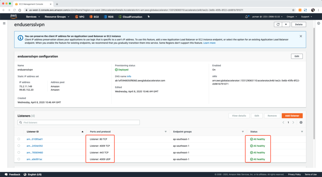 服务都是健康时候,现在就可以使用75.2.11.149和99.83.152.20这两个全球统一IP,在全球任何地点发起访问了。用户的访问将自动获得加速,用户将被定向到最近的AWS区域,然后通过AWS自有海底光缆回传到集中的AWS区域(本例是新加坡)。