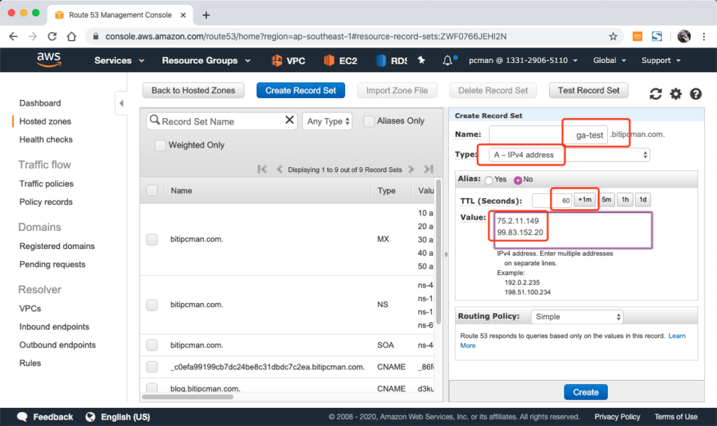 使用IP访问可能存在不方便,例如后续重新调整和发布加速器,IP地址可能会改变,这里将不利于长期使用。因此推荐使用Route53服务,增加新的A记录,将域名解析为IP。域名解析工作也可以使用非AWS平台的解析服务器。