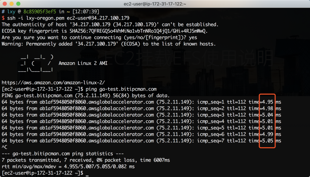 从以上截图可以看到,ping值在5毫秒左右,表示所在区域发起的访问已经就近接入到AWS区域,然后通过AWS骨干网返回源站所在的新加坡节点了。这也就表示加速成功。